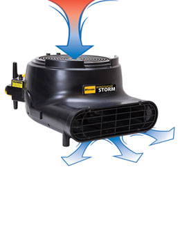 When time is money, you get more drying productivity and profits with the all-new Windshear Storm! Utilizing all-new “Driven Air” technology, this compact unit is changing the blower/dryer market as we know it today. The Windshear Storm is dramatically lighter and smaller, offering high airflow volume with velocity of 3,200 feet per minute. What’s more, with a compact and light “briefcase-style” profile and maximum running amps of only 2.4, this unit creates the perfect Storm of drying performance, size and affordability.